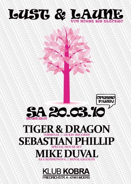 Zum Opening erwaten wir das DJ Team TIGER & DRAGON, die neben Ihren Bookings als Main Act auf der Nature One oder der Ruhr in Love vor allem durch Ihre Charterfolge ?RAPTURE? und ?FEEL? bekannt sein dürften.