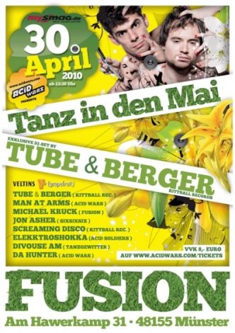 Wer dieses Jahr elektronisch in den Mai Tanzen will kommt in Münster am Fusion nicht vorbei. Die Party Elektropunks Tube & Berger beehren uns in dieser Nacht und werden mit ihrem einmaligen elektrotrash Sound eine Abriss Party ohne gleichen starten. Unterstützt werden sie unter anderem von Mastermind Man at Arms, MAIster Rocker Jon Asher und einigen mehr. Von House, Elektro, Minimal und Techno wird für jeden Geschmack etwas dabei sein. Die ersten 100 Gäste erhalten noch eine Mix CD !