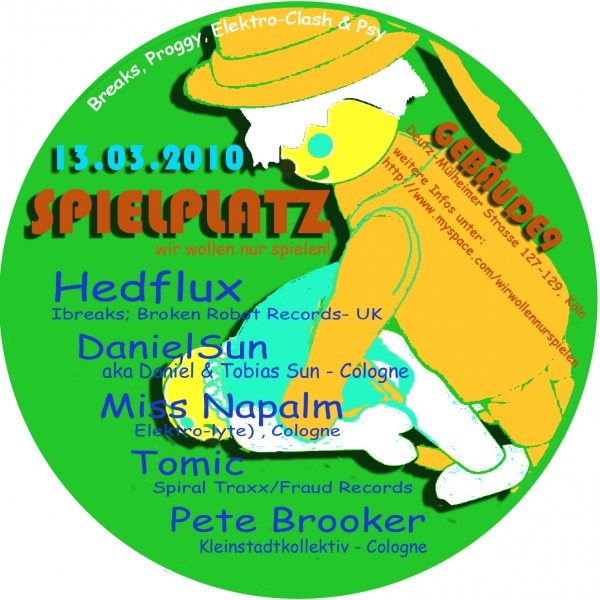 Mit Hedflux, aus England, DanielSun, Miss Napalm und Pete Brooker aus Köln, sowie Tomic von Spiral Trax, wird es ein Ohrenschmaus aus einer gelungen Mischung von Psy, Breaks, Elektro-Clash sowie Progressive.