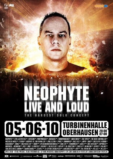 Am 05. Juni wird die Erde beben, wenn Neophyte nach Oberhausen kommt. Neophyte steht sowohl für den außergewöhnlichen Live Act in dreiköpfiger Besetzung als auch für einen Solo DJ Act. Neophyte aus der Hardcore Hauptstadt Rotterdam sorgt schon seit den frühen 90er Jahren für Furore und wird mit hochkarätiger Unterstützung in die bekannte Turbinenhalle einfallen. An diesem Abend dreht sich in der Mainhall alles um den Namensgeber der Veranstaltung. Als DJ wird er im Battle gegen andere Hardcore Größen antreten, wie zum Beispiel Catscan, Partyraiser oder Outblast um nur drei zu nennen. Und auch der legendäre Live Act wird als Battle gestaltet und Neophyte (live) wird gegen Tha Playah (live) antreten. Wenn die Halle nicht schon vorher kocht, wird spätestens hier der Funke überspringen, wenn die alten und neuen Partyhits über die brachiale Anlage auf das Publikum losgelassen werden.
