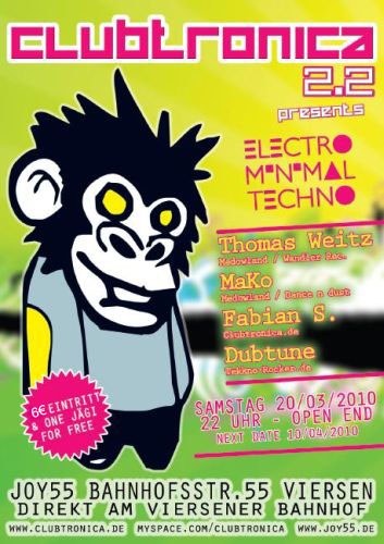 Am Samstag den 20.03.2010 findet die Fortsetzung der CLUBTRONICA im Joy55 in Viersen statt.An diesem Tag präsentiert CLUBTRONICA 2.2 zwei Produzenten aus Wegberg, welche schon erste Erfolge auf den Downloadportalen wie Beatport.com feiern konnten.