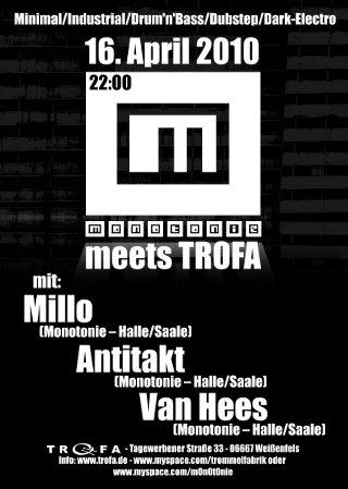 Die Monotonie stellt ein Team junger DJs aus Halle, Leipzig und Merseburg dar, die sich vorwiegend mit alternativer elektronischer Musik beschäftigen. Das Team setzt sich aus den DJs Millo, Antitakt, Haradrim und Van Hees zusammen. Die Monotonie ? Partys, bei denen neben dem Team in aller Regel auch Liveacts und Gast-DJs zu bestaunen sind, finden regelmäßig in der Villa Musicdrome in Halle und im Villakeller in Leipzig statt. Daneben findet die Monotonie zu unregelmäßigen Zeitpunkten auch in anderen ausgewählten Locations in anderen Orten statt ? wie in diesem Fall am 16.04.10 in der altehrwürdigen Trofa in Weißenfels. Nun zu den DJs, die an besagtem Abend für die Beschallung verantwortlich sind: