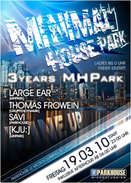 Hattrick, alle guten Dinge sind 3 die Minimal House Park reihe geht ins vierte Jahr und alle sind dabei. Als ich vor 3 Jahren meine erste Party im Parkhouse startete wollte ich in erster linie nur eine Party veranstallten und hätte nie gedacht das sich die Partyreihe so lange hält. Und mit jeden Jahr hat mich der ergeiz noch mehr gepackt die Party ins nächste Jahr zu bekommen und das klappt bis her ganz gut.Auf auf ins nächste Jahr. Der Gastgeber Large Ear hat sich für diesen Abend das beste aus 3 Jahren MHPark zusammen gestellt und sich den Wuppertaler Thomas Frowein ins Haus geholt der schon ein paar mal bewiesen hat das er hinter die Turntables gehört. Einstimmen wird uns [Kju:] der auch des öfteren auf der MHPark gespielt hat und immer wieder bewiesen hat das er der richtige dj für das warm up ist. Nicht zu vergessen Savi der Hausherr der zu jeder Stunde die richtige platte in den Händen hat. Also macht euch gefasst auf einen Super abend.