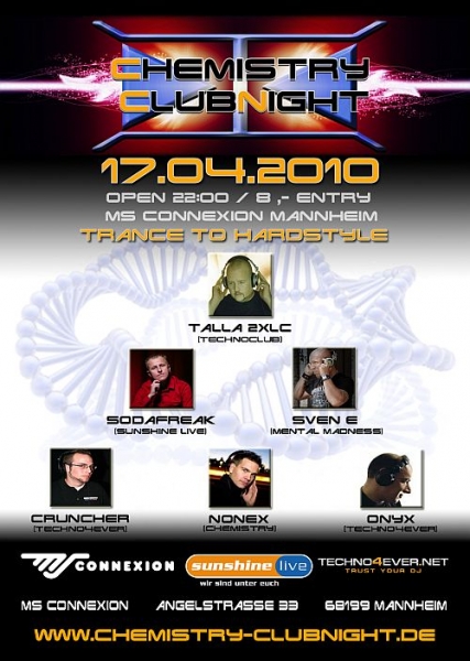 Trancer aufgepasst: Am 17.04.2010 steigt die nächste Chemistry Clubnight "Trance to Hardstyle". Ein neues Zuhause hat die Chemistry Clubnight in der Großraumdiskothek MS Connexion in Mannheim gefunden.