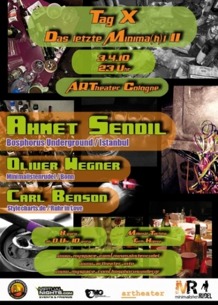 Ein weiteres Mal holen wir einen Premierengast nach Köln. Der Technoguru vom Bosporus AHMET SENDIL [Bosphorus Underground / Istanbul] beschenkt uns mit einem steilen Set. Er ist der beste Minimalact 2008/2009 und mit seinen Produktionen und Brettern wie Federico Milani - Hooker (Ahmet Sendil Remix) steht er ganz oben in den Beatport - und Plattencharts. Sein unverwechselbarer straighter elektronischer Sound hat Ihn groß gemacht und zeichnet Ihn aus. Er verkörpert das liebste Tag X-Motto TECHNO, wie kein Zweiter.