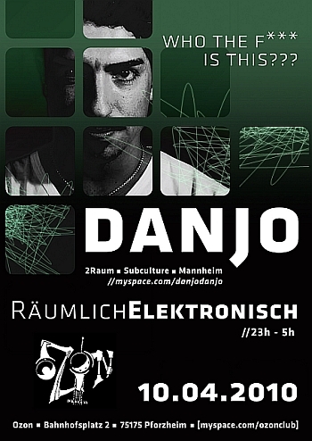Danjo, 2RAUM-Resident der allerersten Stunde, wird musikalisch mit elektronischen Leckerbissen das Ozon versüßen ... Seine Liste mit welchen Dj´s er schon gespielt hat ist lang: LTJ Bukem, Heiko Laux, Whignomy Brothers, Tom Novy, Tonka, Woody,Martin Landsky, Acid Maria, DJ Dag, Marusha, Lerroy Thornhill, Tom Wax, Gayle San, Boris Brejcha, Nick Curly, Johnny D., Ray Okpara, Neke ...