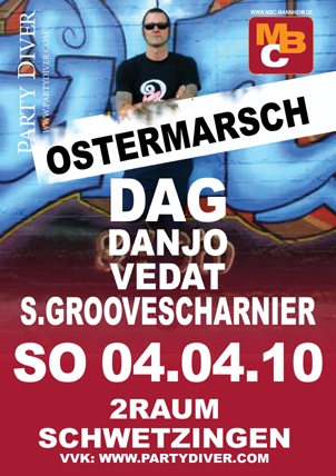 Während sich die Mannheimer Veranstalter Partydiver bisher vor allem mit dem Sky Club im Mannheimer Fernmeldeturm einen Namen machten und sich auch sonst in den letzten drei Jahren mit Events an außergewöhnlichen Orten einen exklusiven Ruf erarbeiteten, marschieren sie am Ostersonntag, den 04. April 2010 erstmals direkt in einen der wohl schönsten und frischesten Clubs, den das Rhein-Neckar-Dreieck zu bieten hat. Zusammen mit einem ihrer wohl berühmtesten Resident-DJs, der Frankfurter DJ-Legende Dag sowie dem electrohousigen S.Groovescharnier, führt ihre Reise in das Herz der Schwetzinger Schlossstadt ? dem 2RAUM, der in zwei Räumen Bar, Club und Lounge verkörpert. Unterstützt werden die beiden von den regional anerkannten DJs Vedat und Danjo, die in dieser Konstellation neben den treiben Trance- und Techno-Beats von Dag und dem funky Electrohouse von S.Groovescharnier mit ihrem Deep- und Techhouse einmal mehr für herzlichen Kontakt im 2RAUM sorgen werden.