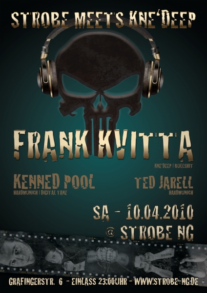 Frank Kvitta?das heisst; entdecke Hardtechno mit seinen ganzen Facetten. Er ist keine Neuer in München, doch seine Gigs waren in jeder Form einzigartig. Auch seine Discography liest sich wie ein Roman. Nature One, Awakenings, Dance Valley, Creamfields, Time Warp und viele mehr. Genauso spektakulär ist die Labelliste auf denen er schon Releast hat. Neben Knedeep Rec., Bullshit Rec., Kvitta Rec. und Abstract Rec. geht es schnell weiter über Artillery, Carnage, Bitshift, bis hin zu Schubfaktor Crowbar, Combat Skill, Highball Und auch hier gibt es fast kein ende! Er gehört zur Gruppe der "Hardtechno Generation"! Frank begleitet die Szene seit Jahren und ist potentieller Mitgestalter dieser. Von ihm wurden neue Trends und Stillrichtungen gesetzt, die sich dann für die folgenden Jahre in Bereich Hardtechno manifestiert haben. Ob als Familienvater oder als Deejay?..Frank Kvitta gibt immer alles! So werden am 10.04 auf wieder mind. 3 Turntables und 2 CD-Player vorbereitet sein. Über all diese wird er hinweg fegen und den Strobe zum Hexenkessel machen. Das allein spricht schon von einem Ausnahmekünstler, der seines gleichen sucht. THATS FRANK KVITTA. Weiter geht es an diesem Abend mit einem gutem Bekannten von Frank Kvitta?.Kenned Pool. Auch er ist in München kein unbeschriebenes Blatt mehr. Mit seiner Party-Reihe ?Hardmunich pres?.? und dem gleichnamigen Label, hat er sich neben dem Deejaying einem Namen gemacht. Bei ihm braucht man auch nur drei Stationen zu nennen, wo er schon gespielt hat?Nature One, U60311, Strobe?.und spätestens jetzt weis man wo er hingehört!