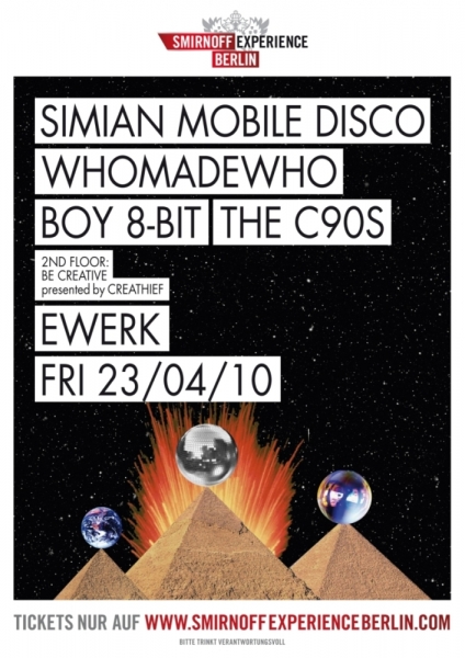Die User haben sich per Online-Voting für eine einzigartige Kombination von Acts entschieden, die vor allem eins ist: laut, bunt, wild und extrem tanzbar. Das Elektro-Duo Simian Mobile Disco werden ihre bis dato aufwendigste Live-Show spielen, Support Act sind die zurzeit heiß gehandelten Dänen WhoMadeWho, als DJs werden Boy 8-Bit und The C90s die Party-Crowd zum Schwitzen bringen. Um den 2nd Floor kümmert sich Creathief aus Frankfurt am Main ? unter dem Motto ?Be Creative?. Tickets bekommt man nur über www.smirnoffexperienceberlin.com. Kurz: Ein internationales und hochkarätiges Line-Up, feierwütige Gäste und eine der besten Locations der Stadt versprechen die Smirnoff Experience Berlin die aufregendste Party des Jahres werden zu lassen.