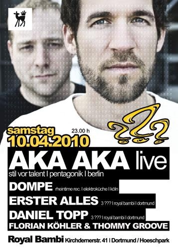 Gemeinsam konzentrieren sich die beiden Jungs jetzt voll und ganz auf ihr Projekt ?AKA AKA?, mit dem sie seit März 2009 bei Oliver Koletzkis Label Stil vor Talent unter Vertrag sind. Ihr Debüt ?Voegeln EP? auf SvT wird von Künstlern wie Dubfire, Claude VonStroke und Troy Pierce supported. Songs wie " Tigerente mit Reis" oder der AKA AKA Remix von "Woodywoodpacker" dürften euch sicherlich auch in den Ohren liegen.