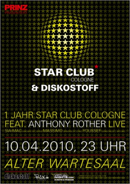 Wir freuen uns auf den 1. Geburtstag unserer einzigartigen Veranstaltungsreihe Starclub Cologne. Nach der letzten, überaus erfolgreichen Kooperation mit Diskostoff, ziehen wir nun stets an einem Strang und gehen gemeinsam an den Start. Für die Veranstaltungsreihe hat es die Konsequenz, dass härtere Töne den Saal beben lassen. Von den housigen Klängen gehen wir zu den technoiden über und rocken die alten Gemäuer. Elektronische Geburtstagsständchen spielen die DJs Anthony Rother, Sia-Mac,Massimo, YOUSSEF.