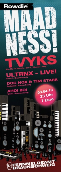 Bevor das Fernmeldeamt für immer seine Pforten schließt wird der April durch "Maadness!" mit basslastigen Partybombs zwischen Nu-Rave, French Electro und Indietronics eingeleitet.Mit Tvyks steht der Resident-DJ der legendären Berliner "Kiss Me, I'm Electric"-Partyserie bereit um die Zündschnur für den Countdown anzufachen. Gemeinsam mit Ahoi Boi und den Brain-Residents Doc Nox und Tim Starr wird er die Boxen mit cutting-edge Electro zum Beben bringen. Der Produzent und Fashionist teilte sich die Turntables bereits mit Soulwax und Zombie Nation und schaffte es vor kurzem sogar in die "BBC Radio 1 Show" von Kissy Sell Out! Als weiteres Highlight steht ein Liveact von Ultrnx auf dem Programm, die sich durch ihrem Remix für Digitalism auf dem Kultlabel Kitsuné und gefeierte Byterock-Liveshows in kürzester Zeit in der Maximal-Electroszene etabliert haben.