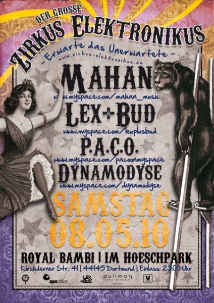 Augen bestaunt und zudem mit eigenen Ohren belauscht werden. Denn Dortmunds lautester und skurrilster Tanzzirkus "Der grosse Zirkus Elektronikus", schlägt erneut sein Zelt auf um Augen, Ohren, vor allem jedoch Tanzbeine, in Stimmung zu bringen.