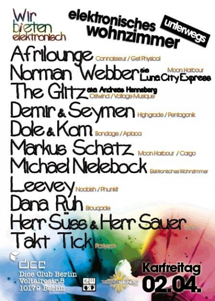 In dieser Nacht werden Afrilounge, die gerade einen fulminanten RMX zu JAIRO CATELOs THE WICKED CREW EP beigesteuert haben, zusammen mit The Glitz, Luna City Express Normen Webber und Dole&Kom, den Gästen des Wohnzimmers, im Dice Club, Elektronisches vom Feinsten kredenzen. Hier verderben nicht viele Köche den Brei, hier wird ein Abendmahl serviert, das Demir&Seymen, Markus Schatz, Süß&Sauer und Leevey geschmacklich hervorragend abrunden. Als ?Dessert? Broquade Labelchefin Dana Ruh und Takt Tick vom Partysan zu bezeichnen, spricht wohl für einen exzellenten Geschmack des Zimmerherrn, der es sich nicht nehmen lässt, auch an diesem Abend, persönlich sein geliebtes Vinyl, in die schmackhafte Elektro - Suppe zu streuen. Es ist angerichtet......Guten Appetit!