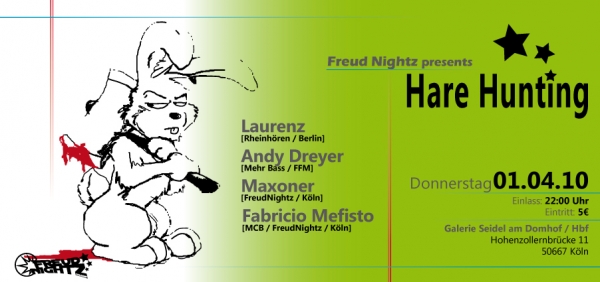 Was war früher der Hase oder das Ei ? Um dieser Frage auf den Grund zu gehen, präsentiert Euch das Freudnightz Team ein weiteres mal im Dom Hof Minimal Sounds und treibende Technobeats. Die Hasenjagd beginnt um 22 Uhr und wir treiben die Hoppel Boppel so lange über die Wiese wie ihr Laune habt. Die musikalische Untermalung der Treib Jagd werden dies mal