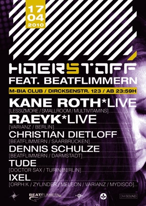 Hoerstoff feat. Beatflimmern ? An diesem Abend fusioniert Berlin mit Saarbrücken auf 2 Floors im M-BIA Club am Alexanderplatz. Das Projekt Beatflimmern um Christian Dietloff und Dennis Schulze steht für außergewöhnliche Talente im musikalischen sowie ausgefallene - innovative Events, nicht nur in Saarbrücken. Mit im Gepäck haben die Jungs, die erst kürzlich von Montpellier nach Berlin gezogene und äußerst charmante, Kane Roth mit ihrem aktuellen Liveset. Sie veröffentlichte u.a. auf Neopren, Multivitamins, Lessizmore und Smallroom und wäre damit alleine schon ein absoluter Garant für einen gelungenen Abend. Mit dem Liveset von Raeyk, seines Zeichens Labelchef von Varianz rec., präsentiert sich ein weiterer Top Act. Abgerundet wird das Ganze u.a. von Ixel der ebenfalls auf ein paar sehr erfolgreiche Releases auf z.B. Zylinder rec. oder Meleon Music zurückblicken kann.