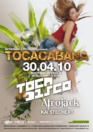 Nach langer Planung ist es endlich soweit, die brandneue Eventreihe von Tocadisco und seiner Frau Nathizinha feiert Ende April ihr Party-Debüt im Bootshaus in Köln. Und wer Tocadisco kennt und schätzt, der weiß, dass dieser Mann keine halben Sachen macht. Der international-erfolgreiche und geachtete Produzent und Plattendreher will mit TOCACABANA neue internationale Clubbing-Maßstäbe setzen. Deshalb wird am Fr.30.04 ( Tanz in den Mai ) der Hafenclub in einen tropischen Dschungel umfunktioniert. Mystische Athmosphäre, Palmen, Bodennebel und natürlich schweißtreibende Beats lassen das Bootshaus in einem neuen Licht erstrahlen. Doch wollen wir den Special-Gast der Nacht nicht außer Acht lassen, denn der Holländer Afrojack ist nicht nur körperlich der größte DJ der Welt (207cm!), sondern auch der Newcomer in der holländischen ?Dirty-Dutch?- Szene . Eine frische energiereiche Weiterentwicklung des angestaubten ?Electro-House? sind sein Markenzeichen. Die internationale Dance Szene reißt sich gerade um Afrojack, aber Tocadisco ist es gelungen ihn ins Boothaus zu bekommen! Das liegt sicherlich auch daran, das Afrojack Toca?s letzte Single ?Better Run? erfolgreich geremixt hat.