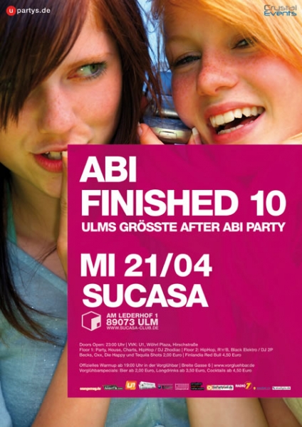 Geschafft! Das schriftliche Abitur ist für die meisten endlich vorbei und eine riesen Last fällt vom Herzen. Dieser Befreiungsschlag muss gefeiert werden! Und wo? Natürlich auf der Abi Finished 10 am Mittwoch, den 21. April 2010 - Ulms größter After Abi Party! Und es geht wie in den Vorjahren wieder richtig zur Sache: Die DJs Zhodiac und 2P, die sonst auf den zahlreichen Unipartys dafür sorgen, dass das Su.Casa bebt, zeigen Euch in Rotation auf 2 Floors, wie eine Tanzfläche bis zum Morgengrauen auseinander genommen wird! Das Beste aus House, HipHop, Electro und Party! Natürlich dürfen auch geldbeutelschonende Getränkespecials nicht fehlen: Becks und Oxx: 2,00 Euro, Finlandia Red Bull: 4,50 Euro, Die Happy und Tequila weiss/braun: 2,00 Euro! Eintritt unschlagbare 5,00 Euro! Wer sich diese Party entgehen lässt, ist selber schuld! Vorverkauf: U1, Wöhrl Plaza, Hirschstrasse. Party on!