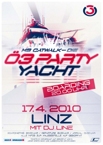 Leinen los und Party! ? Hitradio Ö3 lädt zum Clubbing auf die ?MS Catwalk? und sorgt im April für grandiose Stimmung auf hoher See! Mit an Board der ?Ö3 Party Yacht?: die Ö3-DJs mit den angesagtesten House-Rhythmen und chilliger Lounge-Musik!
