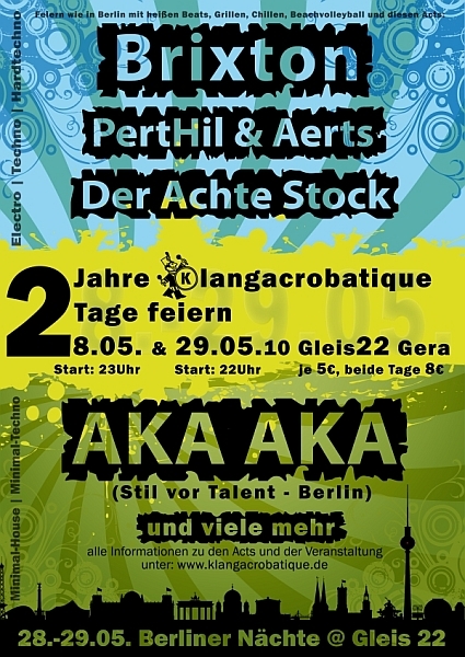 Mindestens 2 Tage Party, das gibt es sonst nur in Berlin. Und damit das Berliner-Partyfeeling auch in unserer Stadt erblüht, holen wir am 29.05.10 AKA AKA vom Label >>Stil vor Talent<< aus der (Party)Hauptstadt nach Gera.