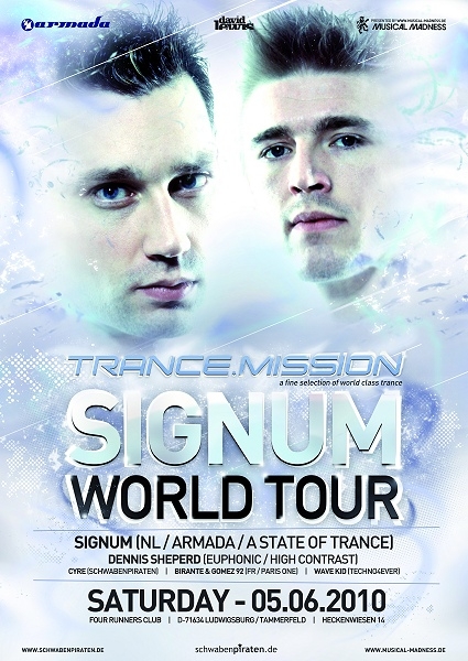Am 05.06.2010 ist es an der Zeit für eine Süddeutschland-Premiere! Denn zur TRANCE.MISSION "Signum Worldtour" wird das holländische Trance-Duo Signum erstmalig die süddeutsche Clubcrowd rocken und mit feinsten Trancetunes verwöhnen! Dieses besondere Event steigt erneut im Four Runners Club in Tamm / Asperg (gegenüber IKEA Ludwigsburg). In einem clubbigen Ambiente mit echtem Underground-Feeling werden die Veranstalter von Schwabenpiraten Events wie gewohnt High Quality Trance bieten. Bei fairen Preisen an Türe und Bar sowie einer massiven Lightshow wird den Gästen erneut die ultimative Trance-Abfahrt geboten.