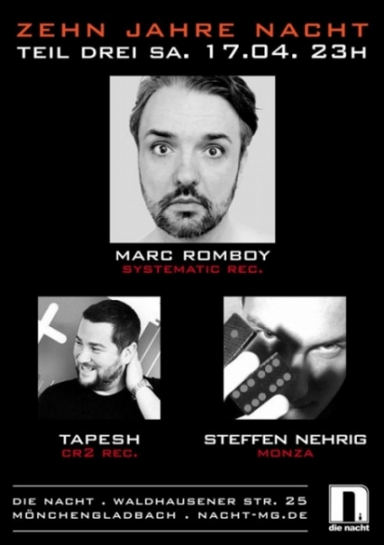 Am SAMSTAG wird die letzte runde des geburtstagsspektakels eingeläutet, an dem die gratulanten MARC ROMBOY, TAPESH und STEFFEN NEHRIG die nacht ausnahmslos zum glühen bringen werden.