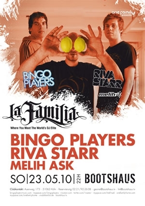 Für Köln hat sich La Familia einer ganz besonderen Aufgabe gewidmet und möchte frischen Housewind ins legendäre Bootshaus bringen. Der Club ist ja weltweit bei DJs der elektronischen Szene berühmt berüchtigt und eher für TechHouse, Minimal und Elektro Abende bekannt. Dennoch waren viel Housegrößen wie David Guetta, Kurd Maverick, Tocadisco, Laidback Luke uvm zu Gast. Nach dem Abgang der Muschi Club Jungs, möchte nun La Familia das Bootshaus weiter mit tollen House-Events bestreiten (vorerst alle 2 Monate) und lässt es gleich mit 2 Top-Stars beim Kick-Off Event am Pfingstsonntag krachen. Keine Mühen und Kosten wurden gescheut und die im Moment erfolgreichsten Breakthrough-Artists, BINGO PLAYERS & RIVA STARR gebucht.