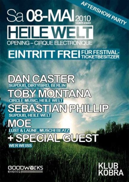 Dazu haben alle Gäste der Heilen Welt ?Cirque Electronique?, die auch noch immer stehen können und Lust & Laune haben weiter zu feiern, freien Eintritt.