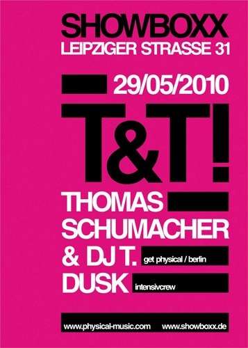Der eine ? Schumacher ? begeistert spätestens seit Ende der 1990er- Jahre die Raver mit Tracks wie ?Ficken No. 3? und ?When I Rock?, der andere ? DJ T. ? bot mit der Gründung des ?Groove?-Magazin (welches er auch bis 2004 leitete) schon früh eine intellektuelle Beschäftigung mit den Themen der elektronischen Musik. Gemeinsam streiten die beiden T?s nun für das innovative Berliner Label ?Get Physical?, dessen Ruhm weit über die Grenzen des deutschen Landes hinausgeht (speziell durch die Veröffentlichungen von Booka Shade, M.A.N.D.Y und vielen anderen berühmten Persönlichkeiten) und welches in der Nacht des 29. auf den 30. Mai im elbnahen Tanzquader seine Visitenkarte abgibt. Lokale Unterstützung gibt es vom Kesselhaus- Intensivcrew- und eigentlich auch Showboxx-Resident-Dj Dusk.
