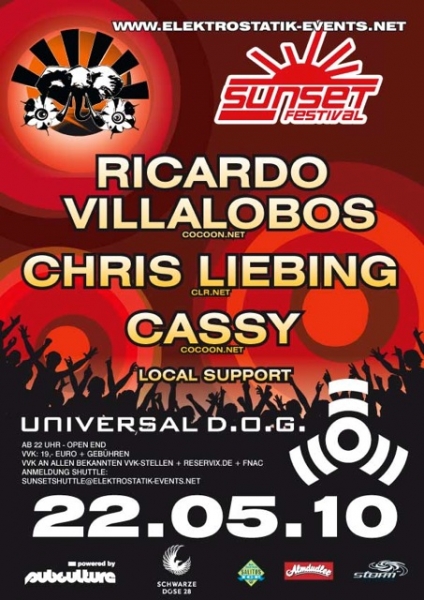 Ein weiterer DJ-Superstar konnte neben RICARDO VILLALOBOS für das diesjährige Sunset Festival gewonnen werden: CHRIS LIEBING, der Meister der harten und funktionalen Sounds. CHRIS LIEBING ist wie auch RICARDO Dauergast auf den größten und angesagtesten Events und Festivals weltweit. Hiervon eine kleine Kostprobe: Time Warp, Love Parade, Sonar, SMS, Mayday, Rave On Snow, Nature One usw. Da wo sich RICARDO und CHRIS LIEBING bereits befinden- in der Elite der weltweit besten DJs, auf diesem Weg befindet sich auch die bezaubernde CASSY, unser dritter hochkarätiger Top-Act. Man kann CASSY nicht auf einen Style beschränken: Zu ihrem Repertoire gehört Minimal, House und Techno. Als Resident Djane der Panorama Bar begann sie von Berlin aus ihren Siegeszug durch die Clubs der Welt. 2009 war wohl ihr erfolgreichstes Jahr. Mit ihrer Musik versprüht CASSY Freude und das spiegelt sich in ihrem Sound wieder. Freut Euch auf CASSY- für sie ist es die Premiere im Universal D.O.G. in Lahr.
