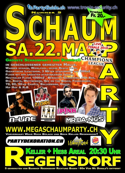Es ist wieder soweit die nächste und grösste MEGA Schaumparty der Schweiz findet am 22.05.2010 bereits zum 5. Mal in Regensdorf im Keller und Hess Areal statt! Europas grösste Schaumkanone wird an diesem Abend den Schaum bis zu 3 Meter anschwellen lassen. Mit den Blackdiamonds Dancers DJ Chris, N-Line, Mr Pink und Star Dj Mr. Da-Nos wird dieser Abend bestimmt unvergesslich werden!