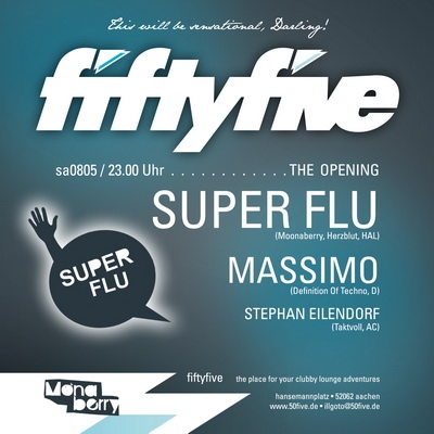 Die beiden Jungs haben 2009 eine unvergleichliche Erfolgsgeschichte geschrieben: Sie stürmten die Dance-Charts, ihr Label Moonaberry gedeiht prächtig und ihr Album "Heimatmelodien" steht in den Stores. SUPER FLU sind das Duo der Stunde und freuen sich, das FIFTYFIVE auf seine Reise durch zahllose Nächte zu schicken. Neben den Flu's gibt sich der Erfinder und Macher der legendären "Definition Of Techno" die Ehre: MASSIMO. Für Support sorgt STEPHAN EILENDORF (Taktvoll) und erwartet Eure leuchtenden Augen im Zentrum der Nacht.