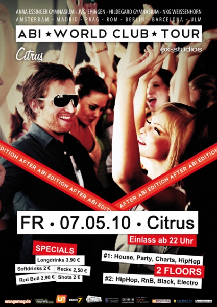 Endlich frei! Das Abi ist endlich vorbei! Der Druck ist weg! Es ist die geilste Zeit Deines Lebens! Und jetzt ist nur noch eines wichtig: Feiern und das Leben genießen! Denn das habt Ihr Euch verdient! Wo? Natürlich auf der Abi World Club Tour - der After Abi Edition! 4 Schulen. 1 Party. Und ein gemeinsame erreichtes Ziel: Das Abitur 2010! Und dass die Abiturienten feiern können, haben sie auch vor dem Abi schon eindrucksvoll bewiesen! Jetzt wird weiter gefeiert: Wie jeden ersten Freitag im Monat heisst es nun wieder: Es ist endlich wieder Abi World Club Tour! Die Gymnasien Hildegard, Anna Essinger, Ehingen, NKG Weißenhorn und JHG Blaubeuren laden euch deshalb am 07.05.10 ab 22:00 ins Citrus ein! Ausnahmezustand! Wie immer legt exklusiv für Euch das DJ Team von ulmercampus.de auf ? diese Jungs heizen Woche für Woche jeden Donnerstag auf den größten Unipartys der Stadt die Tanzflächen bis zur Extase auf: Auf dem Main Floor gibt es clubbigen House, Party und Charts auf die Ohren, der obere Floor ist den Fans von Hip Hop und Electro vorbehalten - DJ Chrizzly wird hier dafür sorgen, dass auch auf den Bänken niemand mehr sitzen bleibt! Und es gibt ein weiteres exklusives Highlight: sensationell günstige Getränkespecials! Becks geht für nur 2,50 Euro über die Theke, alle Longdrinks sind für magere 3,90 Euro zu haben, Red Bull kostet schlappe 2,90 Euro und für alle Softdrinks und für alle Shots sind nur sensationelle 2,00 Euro zu berappen! Diese Party habt Ihr Euch verdient! Party on!