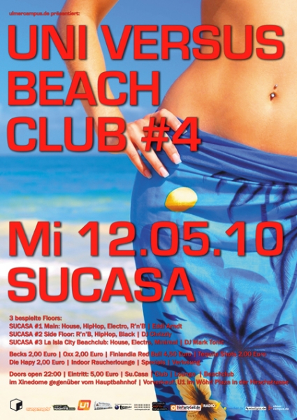 Es ist endlich soweit: Eine der größten Unipartys des Jahres steht auf dem Programm: Am Mittwoch, den 12.05.10 muss im Su.Casa wieder angebaut werden, denn ulmercampus.de - bekannt für die heissesten Unipartys der Stadt - lädt bereits zum vierten Mal zur Uni versus Beachclub! Hier gilt jedes Jahr: Schlange bis vor die Einfahrt zum Parkhaus! Wer sich diese Partylegende entgehen lässt, ist selber schuld, denn es steht einiges auf dem Programm und am nächsten Tag kann aufgrund des Feiertags ausgeschlafen werden: Daher wird auf 3 bespielten Floors gerockt, bis die Sonne aufgeht! Su.Casa #1: House, HipHop, R?n?B und Electro by Eddi Arndt; Su.Casa #2: HipHop, RnB und Black by DJ Chrizzly und Su.Casa #3: La Isla City Beachclub: House, Electro, Minimal by DJ Mark Tonic! Indoor Raucherlounge! Natürlich wird auch wieder der studentische Geldbeutel geschont: Finlandia Red Bull ist für magere 4,50 Euro zu haben, Becks, Oxx Tequila Shots und Die Happy kosten nur sensationelle 2,00 Euro! Wie immer gibt es viele Give Aways und Surprises - lasst Euch diese Party auf keinen Fall entgehen! Der Eintritt kostet nur schlappe 5,00 Euro. Vorverkaufskarten gibt es wie immer im U1 in der Hirschstrasse. Dieses Highlight dürft Ihr nicht verpassen! Mehr Infos auf ulmercampus.de! Party on!
