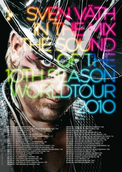 Only a few DJs have an annual schedule like Sven Väth: within his World Tour 2010, he is going to visit a total of 41 clubs in 21 countries between the end of January and the end of May. Besides the two Asian super clubs Womb and Zouk, the highlights of this year are the six dates in Australia, the three-day-trip to South America and the numerous Cocoon Events that are produced around Sven in cooperation with the local promoters.
