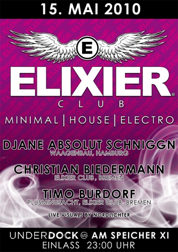´´Nebel´´-´´Nebel´´-´´Nebel´´ Spots und Laser heißen die Waffen, um euch wieder eine Welt aus Licht, Schall und Rauch zu schaffen. Nachdem beim letzen Elixier Club Dj Pruzza vorbeiflog beehrt uns nun seine Djane Kollegin Absolut Schniggn aus dem Hamburger Waagenbau, die den beiden Bremer Djs Biedermann & Burdorf in dieser Nacht zur Seite stehen wir!