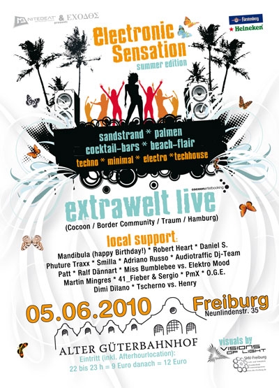 Am Sa. 5. Juni 2010 steigt nach längerer Pause die "Electronic Sensation" mit einem dicken Paukenschlag (respektive einer fetten Bassdrum) im Alten Güterbahnhof (Freiburg). Im Rahmen von Dj Mandibulas Geburtstag, der zahlreiche lokale Dj-Heroes auf insgesamt drei Floors zusammengetrommelt hat, um ihm ein zünftiges Geburtstags-Ständchen abzuliefern, dürft ihr euch auf EXTRAWELT live als Stargast freuen sowie auf eine extra Summer-Area mit Sandstrand, Palmen, Cocktail-Bars & Beachflair und verschickten Visuals von "Visions of Light". Extrawelt sind Arne Schaffhausen und Wayan Raabe aus Hamburg. Mit ihren hochgelobten Releases auf Cocoon, Border Community und Traum Schallplatten gehören Extrawelt zu den meistgefragten Live-Acts weltweit. Gleich mit ihrem ersten unter dem Projektnamen "Extrawelt" veröffentlichten Track postierte sich das Duo im Jahre 2005 ganz weit oben. James Holden signte "Soopertrack" für sein Label Border Community und machte das Release zum weltweiten Clubhit, der die Weichen für die weitere Karriere von Extrawelt stellen sollte. Nach Releases auf dem Kölner Label Traum Schallplatten nimmt kein Geringerer als Sven Väth die Herren Extrawelt unter seine Fittiche. Auf Cocoon erscheint 2006 mit "Titelheld" eine weitere erfolgreiche Platte von Extrawelt, zwei Jahre später veröffentlichen sie auf Cocoon Recordings auch ihr Debütalbum "Schöne neue Extrawelt", auf dem sich die beiden einmal mehr als große Liebhaber melodischer Techno-Sounds präsentieren. Neben der Arbeit im Studio und Ihren Remixes für u.a. Stephan Bodzin, Oliver Huntemann, Alexander Kowalski, Tocadisco, Gregor Tresher, Minilogue und weiteren Acts entwickeln Extrawelt ihre Live-Performance kontinuierlich weiter. Die beiden live hinter den Reglern zu beobachten ist eine wahre Freude, denn man sieht, wie viel Spaß sie gemeinsam an ihrer Arbeit haben; hier wird nicht nur die Maus geklickt, sondern noch an den Pulten, Synthies, Keyboards richtig geschraubt und die Regler bis zum Anschlag gedreht! Support gibt es auf den 3 verschiedenen Floors von Mandibula (happy Birthday!), Robert Heart, Daniel S., Phuture Traxx, Smilla, Adriano Russo, Audiotraffic Dj-Team, Patt, Ralf Dännart, Miss Bumblebee vs. Elektro Mood, Martin Mingres, 41_Fieber & Sergio, PmX, O.G.E., Dimi Dilano sowie von Tscherno vs. Henry. Beginn: 22h, Eintrittspreis (inklusive freiem Eintritt zur Afterhourlocation): 22 bis 23 h = 9 Euro / nach 23.00 h = 12 Euro (kein VVK, nur Abendkasse). More Infos: www.nitebeat.de