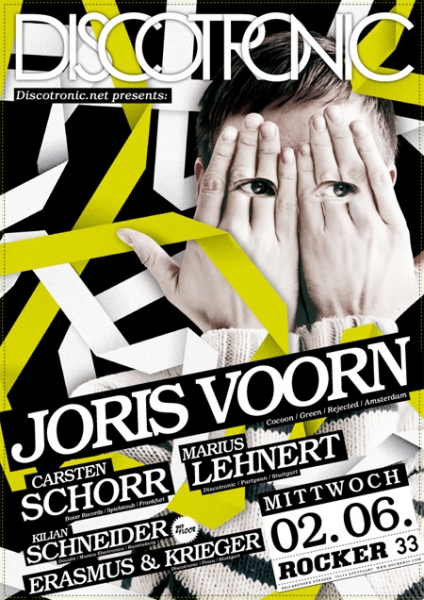 Joris Voorn, der in Amsterdam beheimatet ist, ist seit geraumer Zeit ein vielbeschäftigter und vielreisender Künstler. Dabei führt ihn sein Weg durch die ganze Welt, sodass er in Deutschland nicht allzu oft zu sehen und zu hören ist. Mit Green und Rejected nennt er gleich zwei renommierte Labels sein Eigen und veröffentlicht zusätzlich noch auf so großen Labels wie Cocoon. Mitte Mai erscheint nun einer der Tracks des Jahres von ihm auf Sven Väths Label, den er sicher auch im Rocker 33 spielen wird. Sven Väth ist gleichzeitig Joris' größter und prominentester Fan und die Besucher der Discotronic Night werden bei dieser einzigartigen Gelegenheit sehen, wieso!