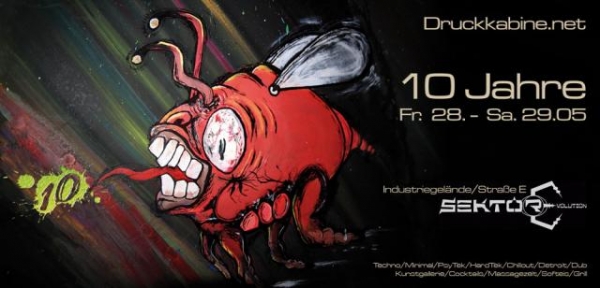 Wir als Druckkabine team DD feiern vom Fr. 28. bis zum 29. Mai (open end) unser 10 Jähriges Bestehen. Aus diesem Anlass geben wir eine große Fatsche im Dresdner Club Sektor Evolution und Ihr könnt alle Dabei sein, beim großen Geburtstags-Spektakel!! An diesen 2 Tagen gibt es eine Menge Attraktionen und natürlich eine gehörige Portion elektronische Musika auf die Lauscher. Als besondere Highlights bieten wir Euch in der Open Air Area ein Massagezelt, ein Kunstgallerie, Softeis, Cocktails und Grillzeugs - die 2 Tage werden Euch richtig versüßt. Weitere Infos siehe Flyer (Line up)...cu eure DKKB