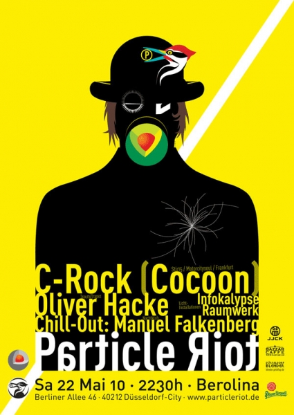 Nach langer Winterpause meldet sich am 22.5. das Particle Riot-Kollektiv zurück aus dem Permafrost. Die üblichen Zutaten ? eine nicht alltägliche Location, durchgeschossene Housemusik von Oliver Hacke und surreale drei-dimensionale Lichtinstallationen von Infokalypse und Raumwerk ? werden diesmal um den Frankfurter Cocoon-Club-Resident C-Rock erweitert. Zudem gibt es eine Chill-Out-Area, die vom gleichsam geschmackssicheren wie überraschenden Freund der Familie Manuel Falkenberg beschallt wird.