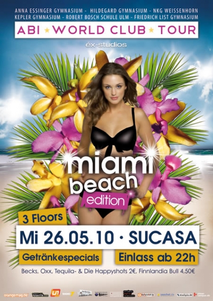 Die Abi World Club Tour legt ihren ersten ausserplanmäßigen Stop ein: im Ulmer Su.Casa! Denn die Pfingstferien wollen sinnvoll genutzt werden! Deshalb laden Euch die Gymnasien Anna Essinger, Hildegard, Friedrich List, Kepler, Robert Bosch Ulm und NKG Weissenhorn zum ersten großen Off Date der Abi World Club Tour ein: Miami Beach Edition - am 26.05.10 ab 22:00 Uhr im Su.Casa! Und Abi World Club Tour mäßig wird es an diesem Abend richtig krachen: Auf 3 bespielten Floors legen die ulmercampus.de Residents das Beste aus den Bereichen House, Party, HipHop, RnB, Charts und Electro auf! Diese Jungs wissen, wie ein Floor so richtig auseinander genommen wird und werden das Su.Casa in einen glühenden Hexenkessel verwandeln! Natürlich gibt es standesgemäß wieder zahlreiche Getränkespecials: Finlandia Red Bull ist für nur 4,50 Euro zu haben, Becks, Oxx, Tequila und Die Happy Shots kosten jeweils nur sensationelle 2,00 Euro! Dem Motto entsprechend wird besonderer Wert auf den Beachclub gelegt - deshalb geht es bereits um 22:00 Uhr so richtig zur Sache! Lasst Euch diese Sensation nicht entgehen! Party on!
