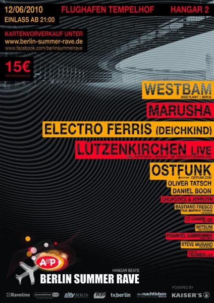 Diesen Sommer gibt es den ersten ?A&P Berlin Summer Rave?, ein Highlight für jeden, der sich Electro-Fan nennt. Die Avantgarde der Berliner Electro-Szene trifft auf alte Loveparade-Legenden und wird die Hangars des Flughafen Tempelhofs beschallen. Auf zwei Indoor-Bühnen sowie einem Open-Air-Bereich garantiert neuste Soundtechnik einwandfreie Beats bis in die frühen Morgenstunden?