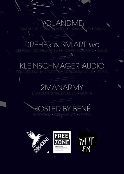 Ein Jahr nach ihrem letzten Auftritt in Leipzig, sind youANDme wieder zurück. Diesmal im Gepäck der Beiden, - Dreher&Sm.Art -einer der gefragtesten Berliner Live Acts und Mister Dreikommanull - Kleinschmager Audio. Unterstützt werden die Mannen bei ihrer dekadenten Nacht im Sweat! von Benè und den Dekadent Labelbetreibern aka 2ManArmy. YouANDme sind nicht zuletzt durch ihre großartigen Veröffentlichungen auf Dekadent und Ornaments dem geneigten Zuhörer ein Begriff. Ihre Set's leben von Ekstase und der Liebe zur Musik. Dies trifft nicht minder auf Toby Dreher und Sascha Mente zu. Ihre Releases waren letzten Sommer ein Dauerbrenner in jedem Sven Väth Set. Was auch dazu führte das Sie auf dem jährlichen Cocoon Ibiza Sampler landeten. Mit Western von Gestern, Landmass und Pueblo waren auch einige Produktionen auf dem dekadentschen Heimatlabel dabei. Neuester Zuwachs der dekadenten Familie ist der Leipziger Nice Guy - Kleinschmager Audio. Seine Ban Pan Buri EP war neben seinen Veröffentlichungen auf Rrygular ein weiteres Zeichen seiner Produzentenqualitäten. Die Rahmenbedigungen für eine berauschende Nacht im Sweat! sind somit gegeben.