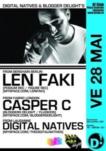 Cela fesait longtemps que l?on attendais Len Faki au D! Club? Le voici enfin! Le résident de l?incroyable Berghain de Berlin, producteur émerite sur le label du dit club, Otsgut Ton, mais aussi patron de Podium et Figure rec, viendra plonger le D! Club dans l?antre de ses beats techno obscure. Il croisera le rythme avec Casper C, résident d?un autre club mythique européen, le Fabric de Londres? Berghain vs Fabric, avec la complicité des Digital Natives? une soirée à ne pas manquer!