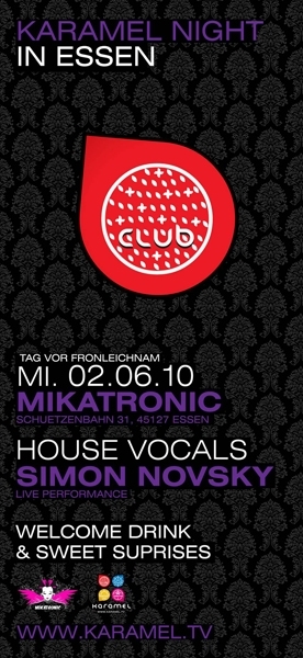 Erst kürzlich feierte der Karamel Club seinen vierten Geburtstag im Düsseldorfer Berolina Bay, jetzt steht der erste feierliche Besuch in der Ruhrmetropole Essen an: Am 2. Juni kommt das ?süße? Clubbing Vergnügen ins Mikatronic. Für besten House Sound sorgen die Karamel Residents. Als ?kleines Special? feiert der neue Düsseldorfer Gesangsstern ?Simon Novsky? seinen ersten Auftritt in Essen.