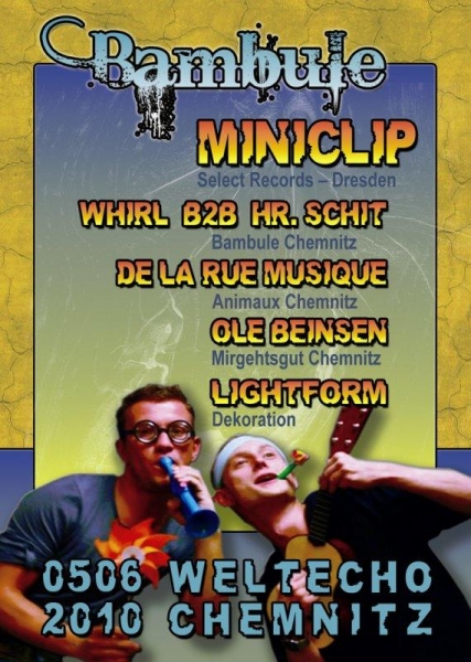 Das DJ-Team MiniCLIP aus Sachsen´s Hauptstadt ist kein Freund großer Worte. Stattdessen lassen mnmlstx und Nic Dencer lieber Taten - pardon - ihre Musik für sich sprechen: Zeitgemäßer elektronischer Sound, der minimalistisch, mal housy und groovy, dann wieder verträumt oder straight nach vorn durch Körper und Geist geht und im höchstem Maße tanzbar ist. Getreu ihrem Motto "Alles kann ? nichts muss" kennen die beiden keine Grenzen, so dass sich durchaus schon mal ein 80er Jahre Klassiker in ihre Sets mogelt. Damit Ihr euch schon mal darauf einstimmen könnt, liefern De La Rue und Ole Beinsen im Warmup ernst zu nehmenden elektronischen Irrsinn und Spielerei von ihren Plattentellern, dem Whirl & Hr. Schit abschließend noch die Krone aufsetzen. Früh kommen lohnt sich also!
