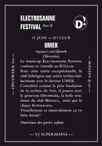 Avant le festival Electrosanne qui prendra place le dernier week-end d?aout, ses organisateurs s?associent au D! Club le temps d?une soirée afin d?y dévoiler tout ou partie de la programmation du festival? Pour plonger le clubber dans l?ambiance Electrosanne, retrouvez des VJ?s qui animeront visuellement la soirée, mis en rythme par notre résidente Masaya et un des maîtres de la techno minimale: UMEK. Considéré comme le père fondateur du ?son techno de l?Est?, inscrit dans le Dj Mag Top 50 des meilleurs dj?s de la planete depuis de nombreuses années, Umek produit ou remixe un nombre incroyable de tracks par année, sur ses propre labels 1605 ou Recycle Loops, mais aussi Turbo ou Cocoon? Soirée à ne pas manquer!