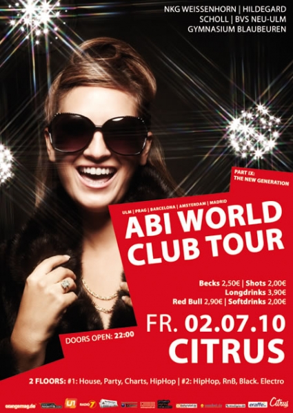 Sie ist legendär. Sie ist nur einmal im Monat. Sie ist das Highlight schlechthin: Die Abi World Club Tour! 5 Schulen! 1 Party! Ein Ziel: Das Abitur 2011! Ja richtig - 2011! Denn die zukünftigen Abiturienten haben das Partysteuer übernommen und werden Euch beweisen, dass nicht nur die ehemaligen 13er so richtig feiern konnten und auch die nächste Generation weiss, wie eine Party so richtig gerockt wird! Die Gymnasien Hildegard, NKG Weißenhorn, Scholl, BVS Neu-Ulm und das JHG Blaubeuren laden euch am 02.07.10 ab 22:00 zur Premiere in den Citrus Club ein! Und diese Party kann sich sehen lassen! Exklusiv für Euch an den Turntables ist das DJ Team von ulmercampus.de ? diese Jungs heizen Woche für Woche auf den größten Unipartys der Stadt die Tanzflächen bis zur Extase auf: Auf dem Main Floor gibt es House, Party, RnB und Charts auf die Ohren, der obere Floor ist den Fans von Hip Hop, Black, RnB und Electro vorbehalten! Und wie immer gibt es sensationelle Getränkespecials! Becks geht für nur 2,50 Euro über die Theke, alle Longdrinks sind für magere 3,90 Euro zu haben, Red Bull kostet schlappe 2,90 Euro und für alle Softdrinks und für alle Shots sind nur sensationelle 2,00 Euro zu berappen! Wer sich diese wilde Party entgehen lässt, ist selbst schuld? Party on!
