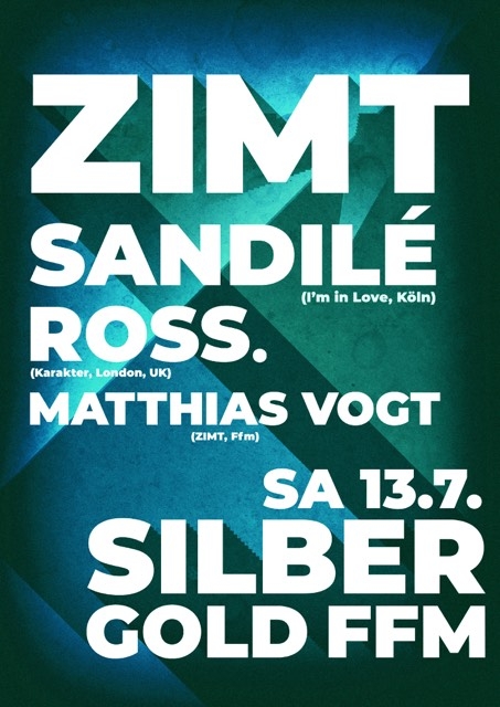 Ross. kommt aus London, ist Tontechniker und lebt abwechselnd in London, Frankfurt, Amsterdam und überall wo sein Hut gerade ist. Als Freund der Familie spielt er zum ersten Mal bei ZIMT, er bestreitet das Opening. Den Abschluss bildet traditionell ZIMT Housemeister Matthias Vogt, der den nach vorne gehenden Sound von Ross, sowie die tiefen Frequenzen von Sandilé mit seiner Definition von House abrunden wird. Seine neuen Releases auf Suol und Polytone hat er sicherlich mit im Gepäck. Es wird wieder ZIMT!