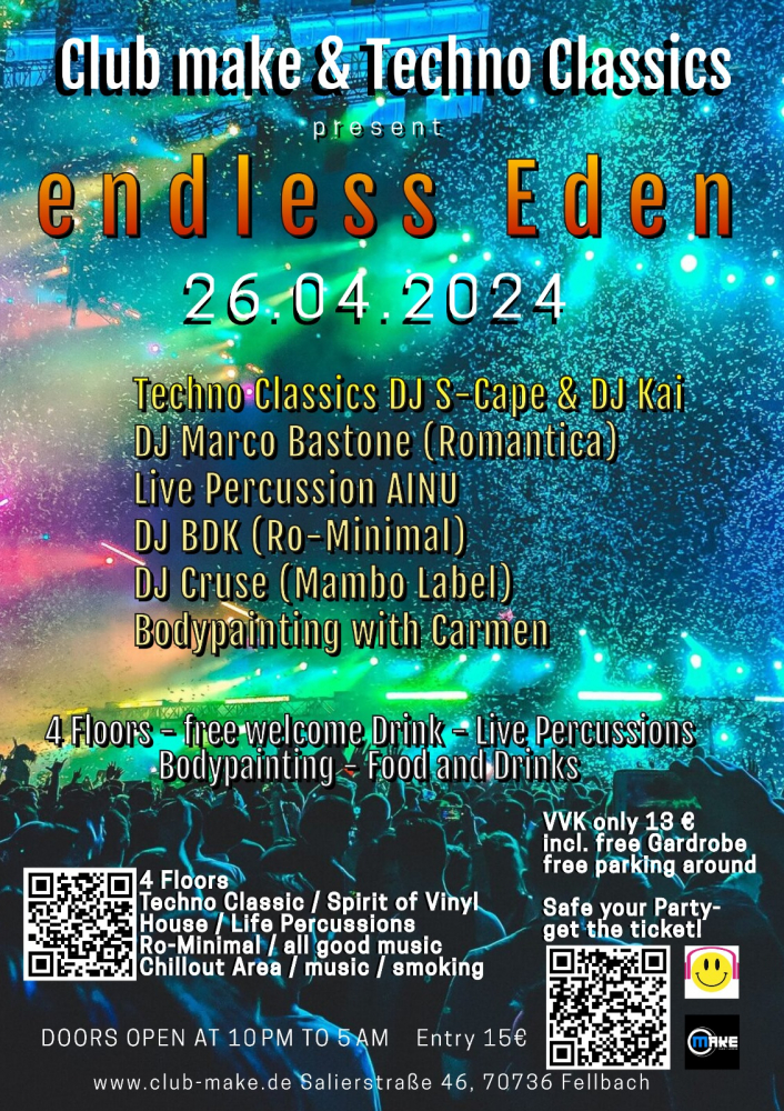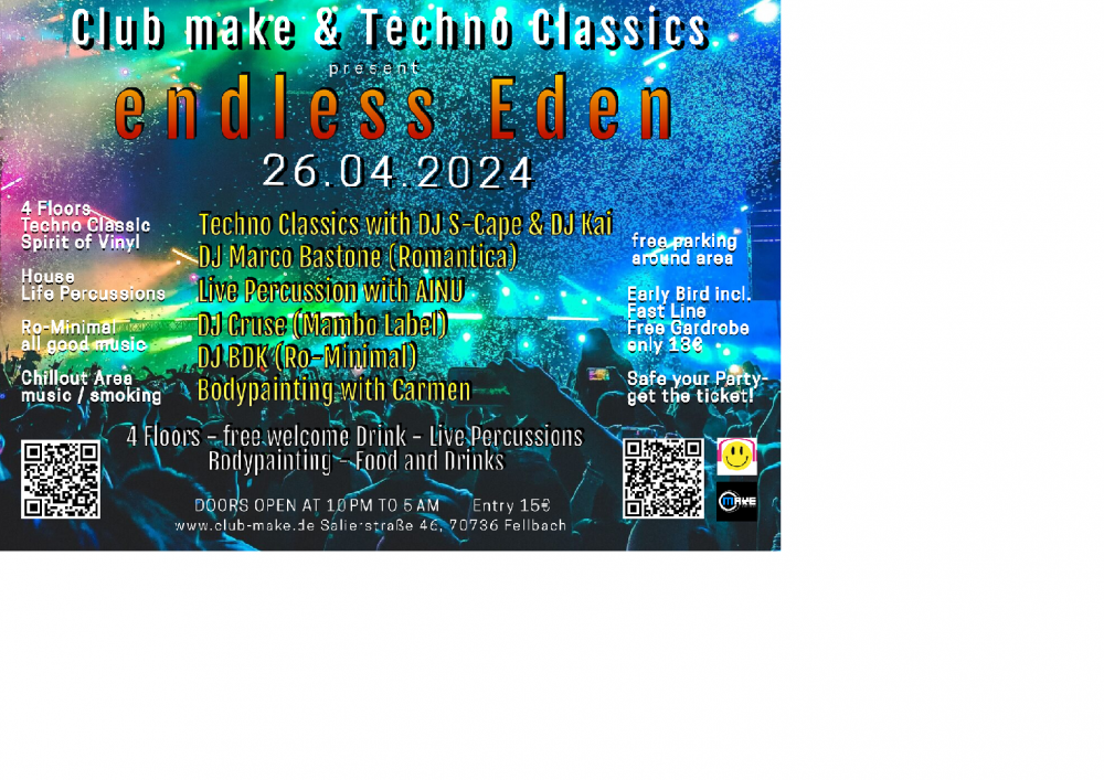 Willkommen im endless Eden - wo die pulsierenden Beats den Himmel erobern und die Nacht in eine unendliche Oase der elektronischen Ekstase verwandeln. Tauche ein in eine Welt aus bekannten Beats, hypnotischen Rhythmen und futuristischen Klängen, während wir gemeinsam die Grenzen des Vergnügens erkunden. Inmitten einer üppigen Landschaft aus Lichtern und Klängen erwartet dich eine unvergessliche Reise durch die Tiefen der Techno-Musik. Lass dich treiben von der Energie dieser endlosen Nacht und entdecke dein persönliches Paradies auf dem Dancefloor des endless Eden.